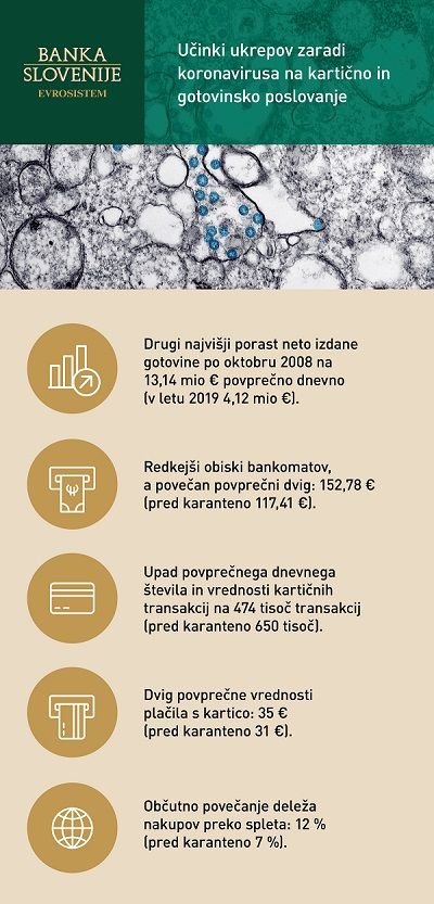 Ob razglasitvi epidemije v Sloveniji, podobno pa je bilo tudi v drugih evropskih državah, se je izkazalo, da se je povpraševanje po gotovini močno povečalo, in sicer predvsem iz namena denarja kot hranilca vrednosti. Največji porast v povpraševanju po gotovini smo (v smislu neto izdane gotovine) zabeležili neposredno ob razglasitvi epidemije, ko so prebivalci hiteli v trgovine, da si zagotovijo vse potrebne dobrine pred zaustavitvijo javnega življenja. Precej prebivalcev si je v tem času zagotovilo tudi dodatno zalogo gotovine.
