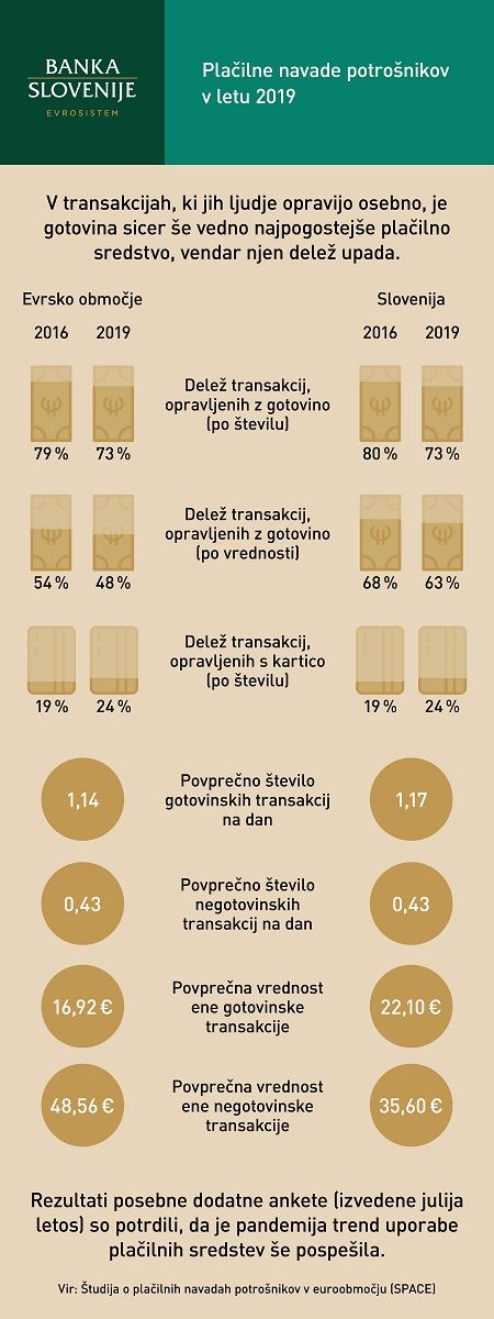 Gotovina ostaja največkrat uporabljen plačilni instrument, kaže študija o plačilnih navadah potrošnikov (SPACE), ki jo je danes objavila Evropska centralna banka. Leta 2019 je bilo v povprečju evrskega območja 73 % vseh transakcij potrošnikov na fizičnih prodajnih mestih in med posamezniki opravljenih z gotovino, 24 % pa s kartico. Posebna anketa o vplivu pandemije koronavirusa je pokazala, da je aktualna zdravstvena kriza trend upadanja uporabe gotovine nekoliko pospešila.