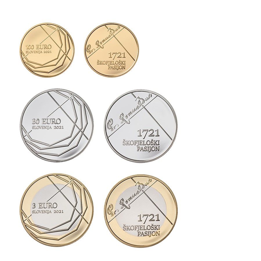V Banki Slovenije smo ob 300. obletnici Škofjeloškega pasijona pripravili dvokovinski zbirateljski kovanec za 3 EUR v tehniki visokega sijaja (proof). Nakovanih je bilo 750 kovancev, ki so pakirani v plastični kapsuli in so naprodaj od 12. maja 2021.