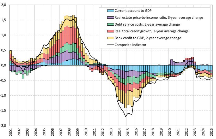 The individual risk indicators are combined into a composite indicator so as to optimise the predictive power of the early warning of the crisis five to twelve quarters before the outbreak of the crisis. Figure 3 illustrates the value of the composite indicator in the first quarter of 2025, and the individual indicators’ contributions to the composite indicator. The composite indicator underwent a downward reversal in early 2023, as a result of lower credit growth and a decline in the current account surplus as a ratio to GDP. In the first quarter of 2025, the composite indicator slightly increased compared to the previous quarter.