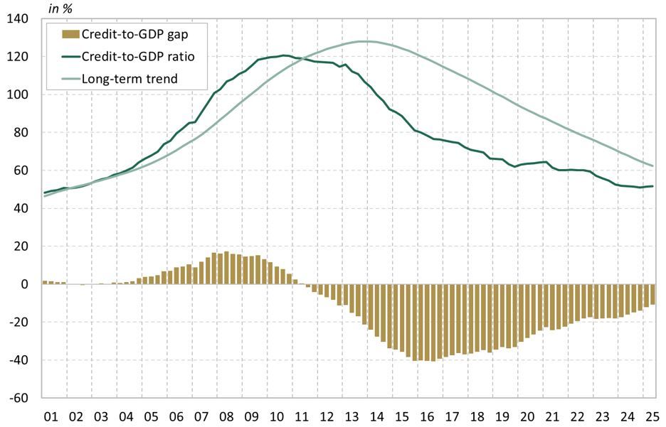 The table shows that the credit-to-GDP gap is negative (in the amount of -10.8%), whereby the credit-to-GDP ratio stands at 51.6% (see Figure 2). The gap between the credit-to-GDP ratio and the long-term trend is still profoundly negative, on account of the extremely high growth in lending to the private non-banking sector in the period before the global financial crisis.12 Credit growth to the private non-financial sector decreased to 3.3% in the second quarter of 2025, representing an decrease of 0.2 percentage points compared to the previous quarter. The average risk weight (51.9%) slightly decreased compared to the previous quarter. Compared with the previous quarter, the growth in used residential real estate prices increased by 1.3 percentage points to 6.4%. The banks performed well in the second quarter of 2025: ROE stood at 18.7%. Given that the banks’ high profits are not dependent on the take-up of excessive risks, the high ROE is not problematic. The ratio of credit to gross operating surplus, which is a measure of private-sector indebtedness and reflects the corporate sector’s capacity to finance debts, remains low.