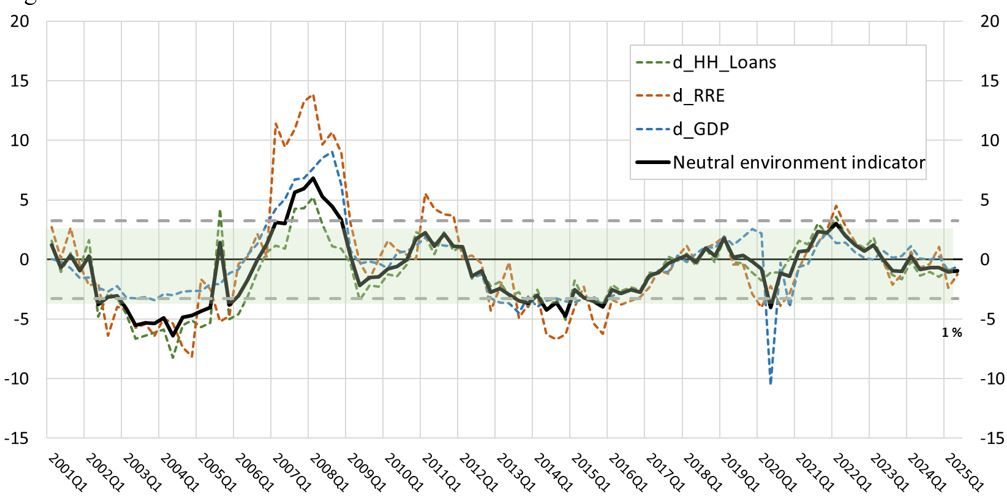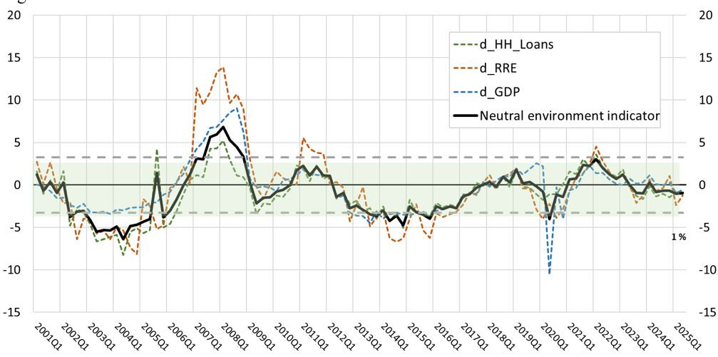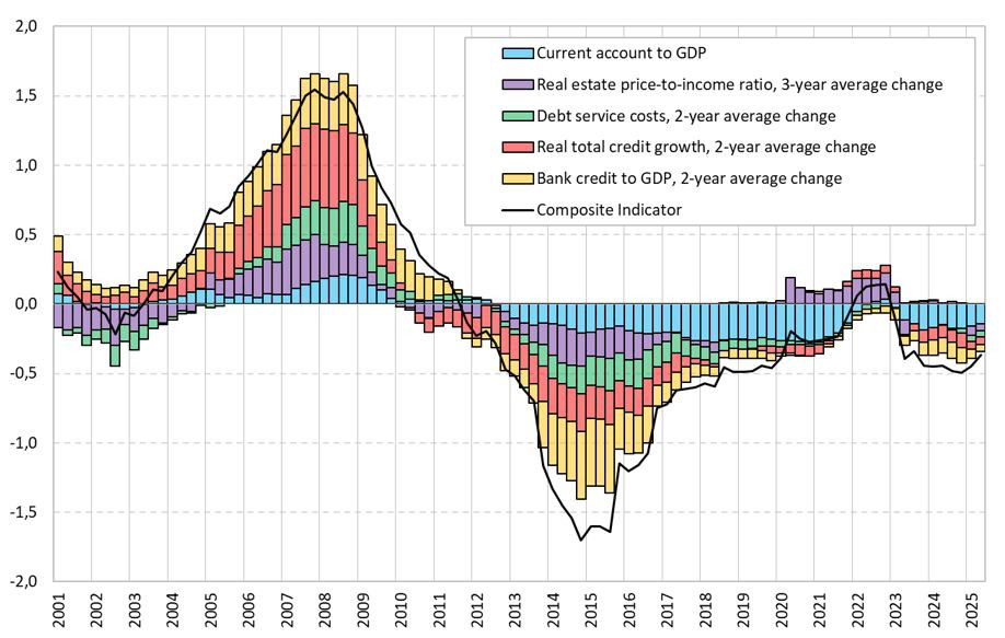 The individual risk indicators are combined into a composite indicator so as to optimise the predictive power of the early warning of the crisis five to twelve quarters before the outbreak of the crisis. Figure 3 illustrates the value of the composite indicator in the second quarter of 2025, and the individual indicators’ contributions to the composite indicator. The composite indicator underwent a downward reversal in early 2023, as a result of lower credit growth and a decline in the current account surplus as a ratio to GDP. In the second quarter of 2025, the composite indicator increased compared to the previous quarter.