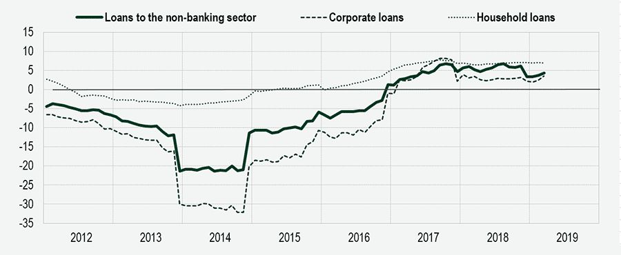 Figure 1: Loans to the non-banking sector, year-on-year growth, %