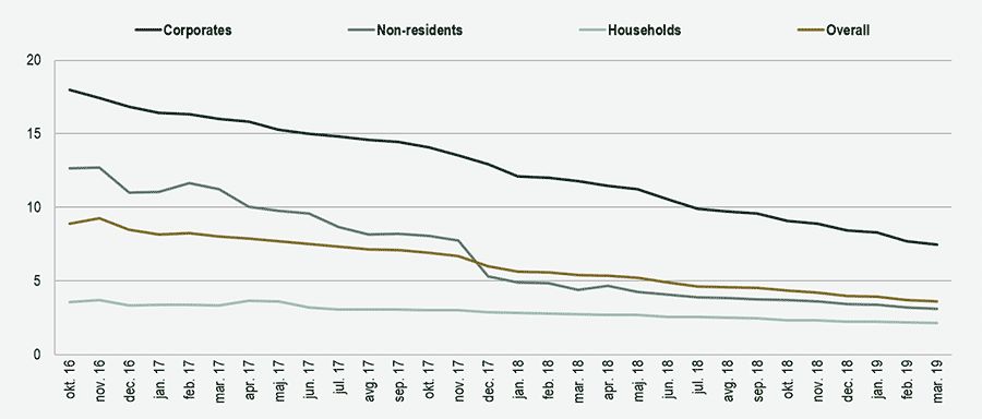 On the investment side, in contrast to the previous months liquid forms of investment declined by EUR 163 million in March 2019 (but increased by EUR 353 million overall in the first quarter), while investments in securities increased slightly. The banks are continuing to focus on household lending via housing loans and fast-growing consumer loans. The banks also increased their corporate loans by EUR 252 million in the first quarter of 2019, more than in the whole of 2018. Year-on-year growth in corporate loans had increased to 3.5% by March 2019, having averaged 2.9% in 2018.