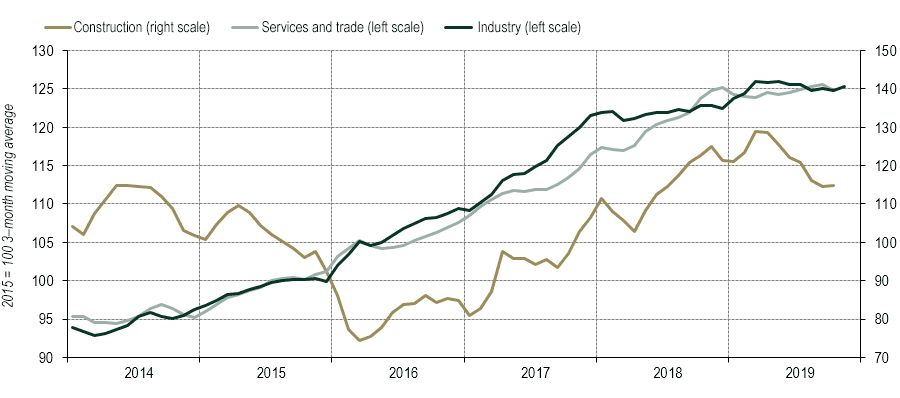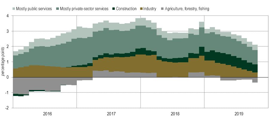 Similarly to the euro area, in Slovenia too the situation on the labour market remains relatively good, given the slowdown in the international environment and in the domestic output climate. Employment growth is slowing, but remains high relative to GDP growth. Labour costs are continuing to rise, and nominal growth in the average gross wage over the first ten months of last year was almost 1 percentage point higher on average than in the previous year. Because labour productivity is stagnating at the same time, cost pressures are strengthening, which is being reflected in higher core inflation (headline inflation remains moderate, having averaged 1.7% in 2019), and a weakened dynamic in certain competitiveness indicators. The same process is driving higher growth in private consumption.