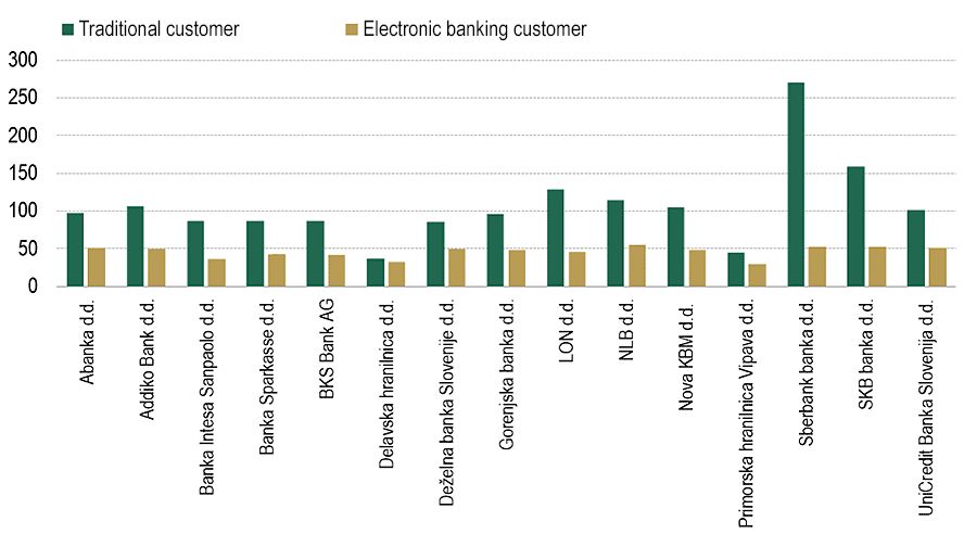 The fees for electronic banking customers transacting primarily via online banking are a half lower on average than those charged to traditional customers transacting primarily via bank counters. Banka Slovenije attributes this to the pricing policies of certain providers, who are trying to use prices to direct customers to more efficient electronic market channels.
