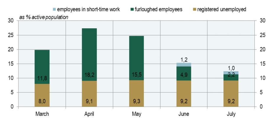 Note: The number of employees included in the two government emergency measures is based on applications processed by 13 October 2020. Sources: SORS, Employment Office, Banka Slovenije calculations