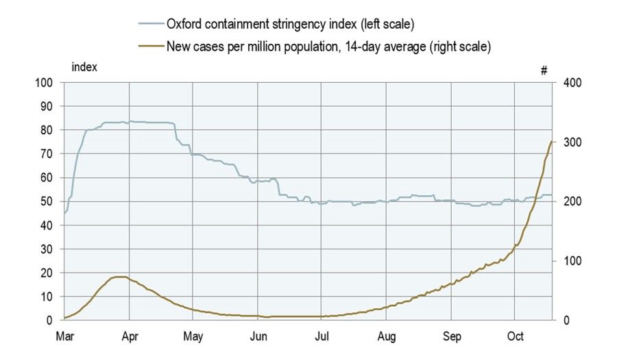 Figure: Epidemiological picture in the euro area and stringency of containment measures