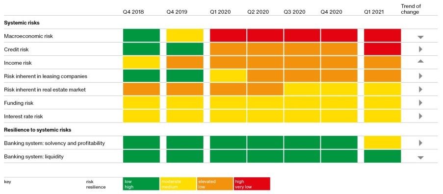 The banks’ resilience to systemic risks, which was high for the majority of 2020, has deteriorated in the solvency and profitability segments, and is now medium. Amid the anticipated deterioration in the quality of the credit portfolio, the banks might also begin to see a decline in their capital ratios. There is also considerable variation in the level of resilience at individual banks, given the differences in the structure and quality of their credit portfolios and in their capital surpluses. Bank resilience in the liquidity segment remains high, again with variation between individual banks.