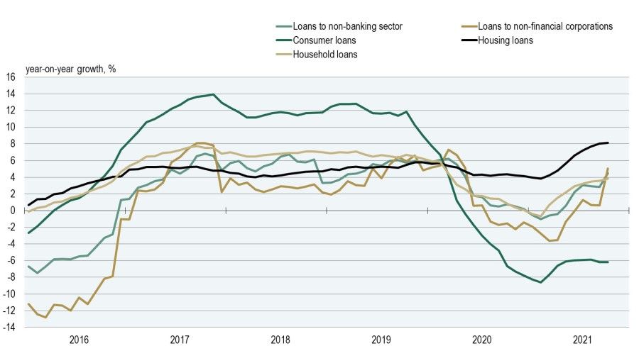 Lending to the non-banking sector began to increase in year-on-year terms in the second quarter of 2021, the rate reaching 4.5% by October. Growth in household lending reached 3.8% in October, and was driven primarily by growth in housing loans. Year-on-year growth in housing loans has increased sharply in recent months and reached 8.1% in October, while the year-on-year decline in consumer loans has stabilised in recent months (it stood at 6.2% in October).