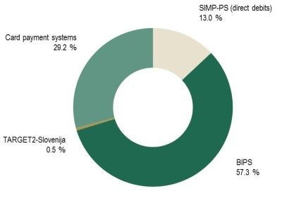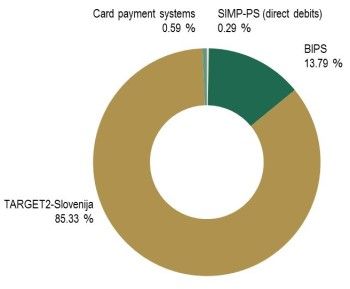 Payment systems for SEPA payments (70.28% of the total) and for card transactions (29.21%) account for the largest shares of all transactions. Both are for the settlement of retail payments, for which reason these payment systems account for merely 14.67% of total transaction value. By contrast, the TARGET2-Slovenija system is primarily for the settlement of large-value payments, and accounts for 85.33% of total transaction value but just 0.51% of all transactions.