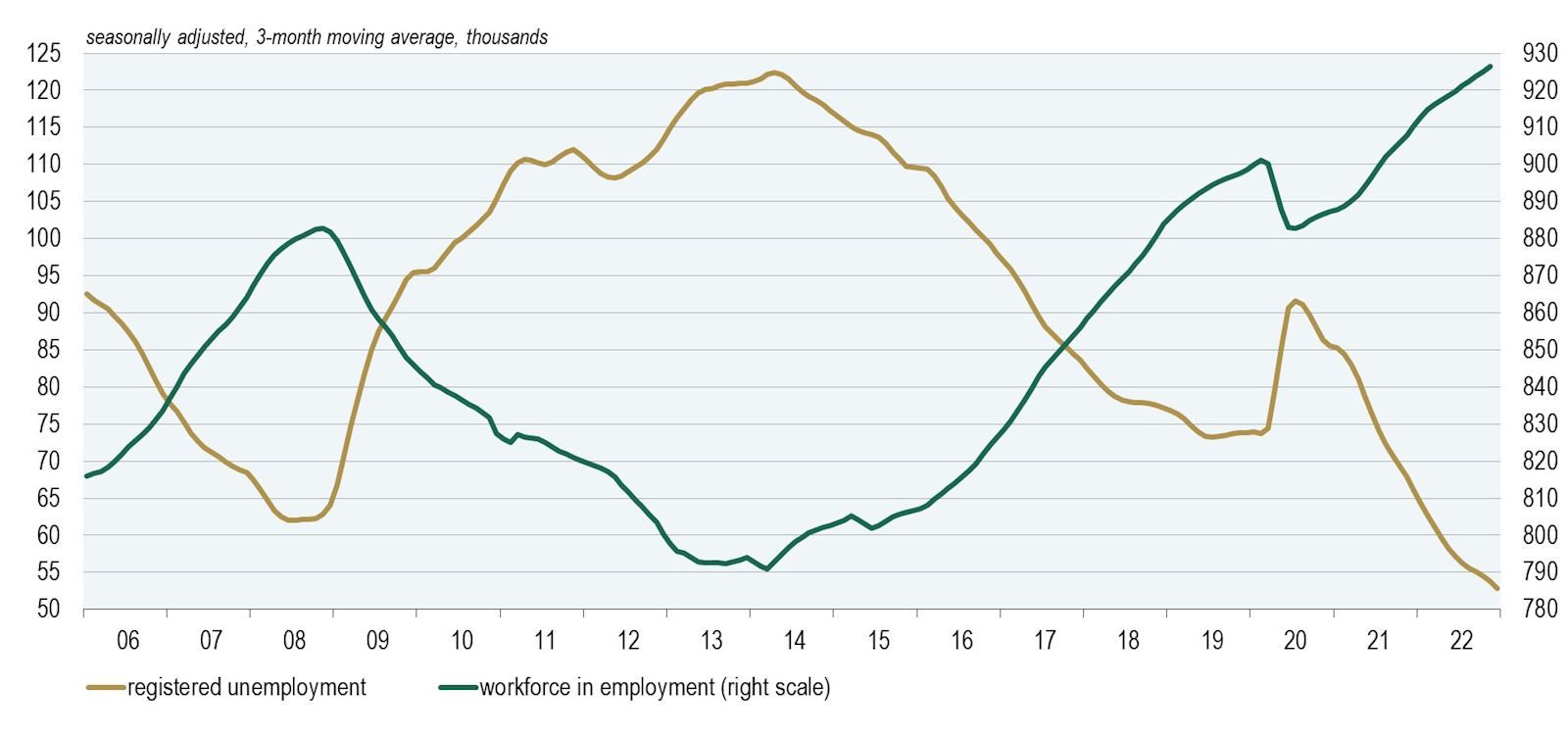 In the domestic economy the export sector faced a difficult external environment. The energy and manufacturing sectors in particular faced uncertainties in the international environment and strong cost pressures. Domestic demand remained solid according to our assessments, and the economic sentiment improved in the total economy. The nowcasts suggest quarterly GDP growth of 0.1%, which given the quarterly figures as currently released would entail annual GDP growth of 4.7% in 2022.