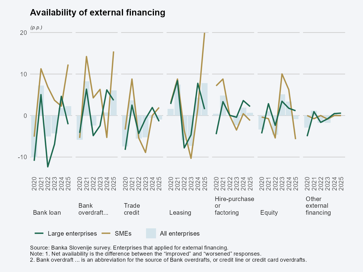 The Survey on Access to Finance of Enterprises, which Banka Slovenije has been conducting since 2011, revealed that from the perspective of factors limiting performance, 2025 saw a rise in the importance of costs of production or labour, foreign demand and supply chains, while the importance of other factors diminished or remained unchanged. Access to financing remained one of least important limiting factors according to firms.