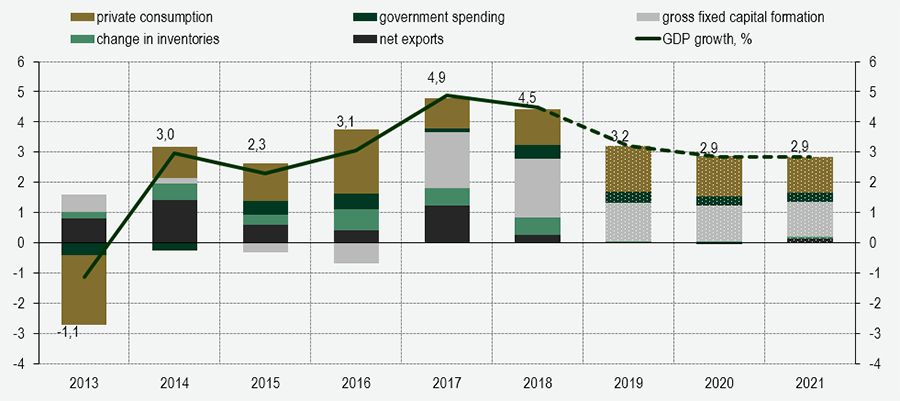 The developments on the labour market will however strengthen household disposable income. This will provide for slightly higher growth in private consumption, and continuing demand for residential real estate, where fast-rising prices are primarily the result of a shortage of supply. Growth in private housing investment is therefore expected to gradually strengthen. The financing conditions remain favourable, and alongside firms’ significant internal resources from retained earnings are continuing to provide for solid growth in investment by the corporate sector in Slovenia. Economic growth will also continue to be supported by government investment: the disbursement of EU funds and the execution of major investment projects are expected to pick up pace.