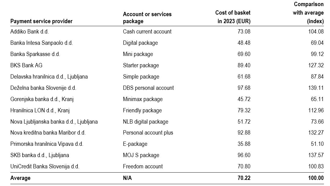 To ensure the straightforward comparability of the services offered by banks and savings banks, the calculations for each bank are based on the same basket of payment services, which reflect the payment habits of the typical customer. Banka Slovenije thus provides an overview of the full package of services offered by all banks and savings banks on its website. The price comparison of the baskets of consumer payment services serves as an informative aid to choosing the most suitable banking package.