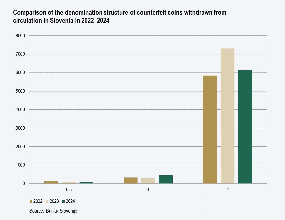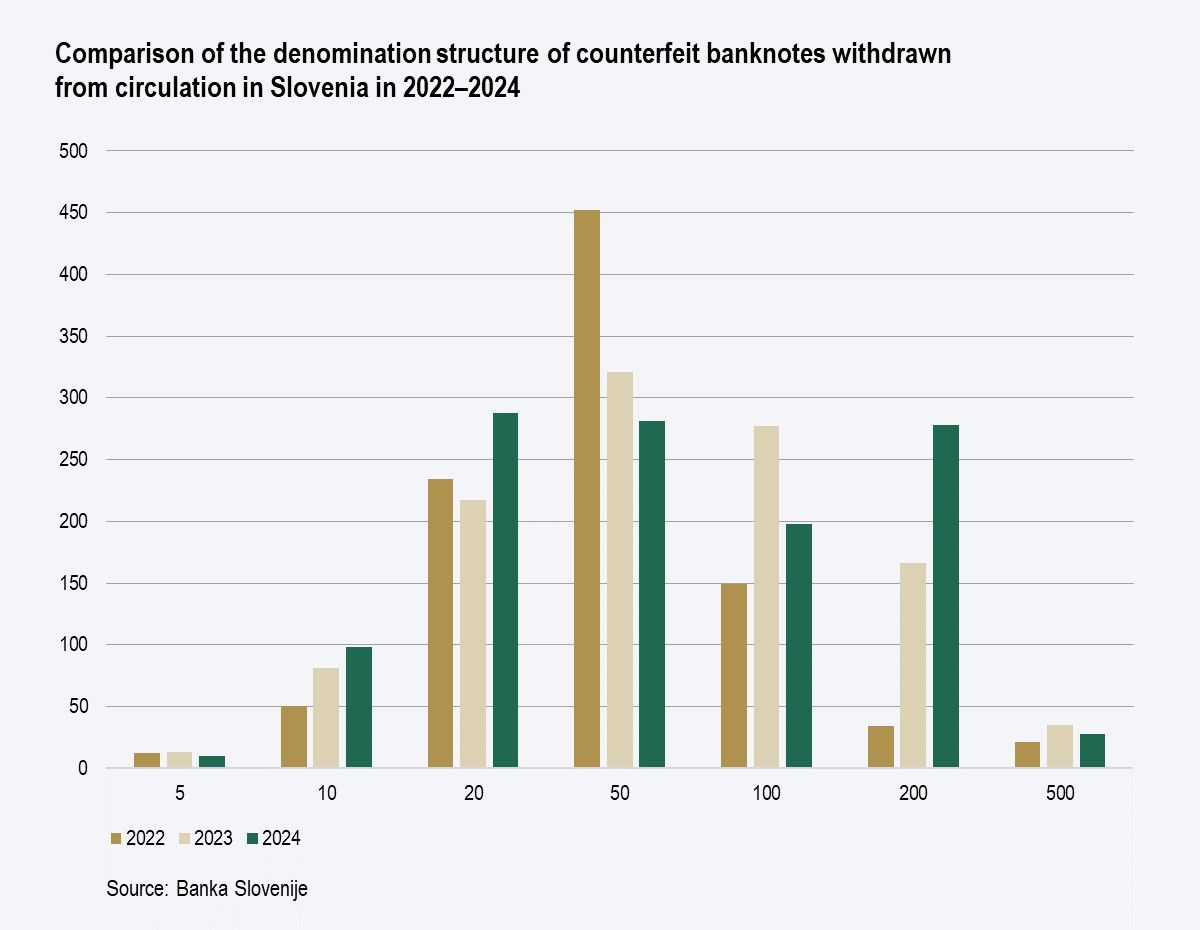 A total of 1,181 counterfeit euro banknotes and 6,665 counterfeit euro coins were withdrawn from circulation last year in Slovenia. The number of counterfeit banknotes was up by 73 (7%) on the previous year, while the number of counterfeit coins was down by 1,025 (13%). While the €2 coin remains the most frequently counterfeited coin (accounting for over 92% of all counterfeit coins), the number of withdrawn €10, €20 and €200 counterfeit banknotes increased in 2024. The total value of counterfeit euro cash detected increased by 7.4%, to €123,009.