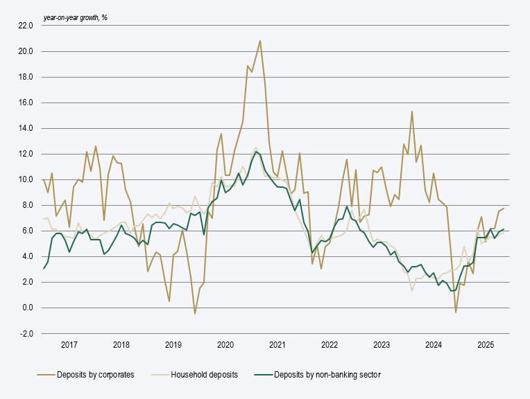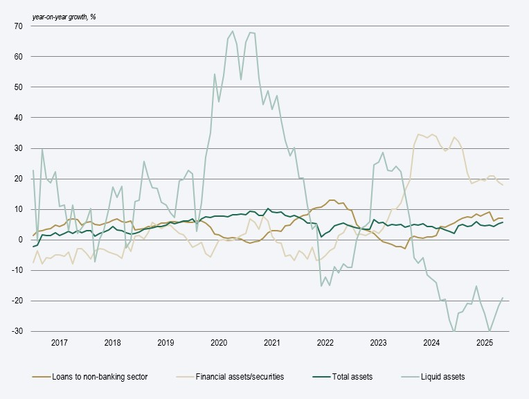 In November, the banking system’s total assets increased by EUR 329 million, reaching an annual growth of EUR 3.1 billion, or 5.8%. Lending to the non‑banking sector rose by EUR 188 million, mostly driven by household lending. Portfolio quality deteriorated slightly due to an increase in non-performing exposures (NPE) among non-financial corporations. The increase in NPEs is concentrated in a small number of firms, mainly within the manufacturing sector. Profit before tax remained above average at EUR 992 million, although it has been gradually declining in line with the reduction in net interest income.