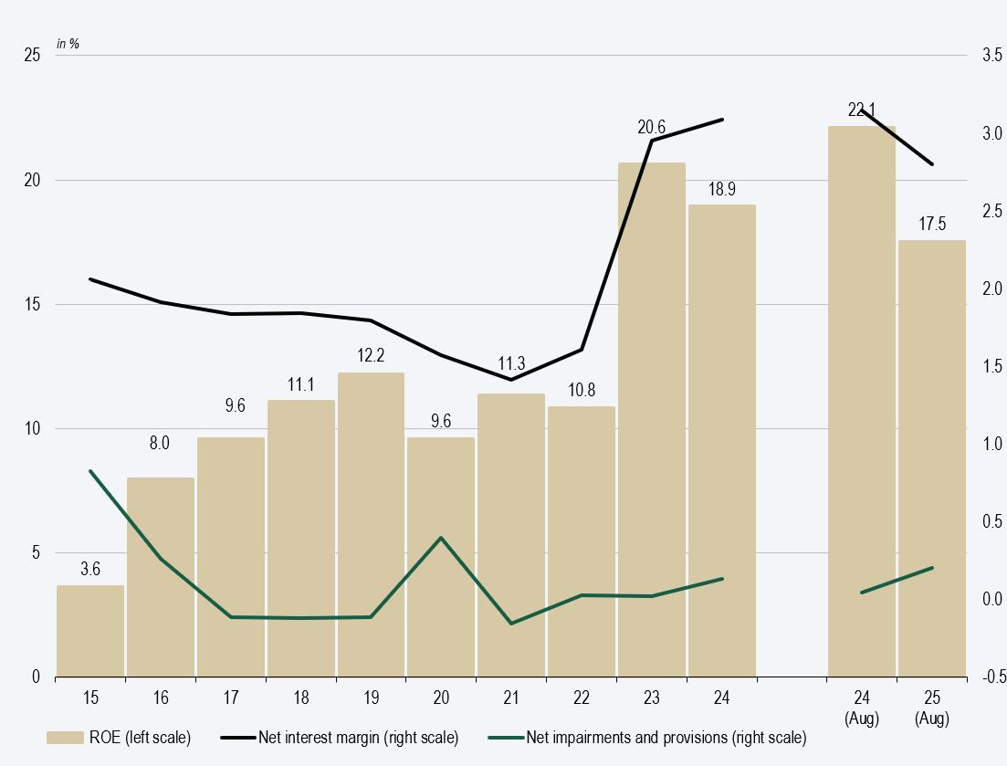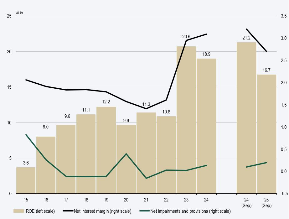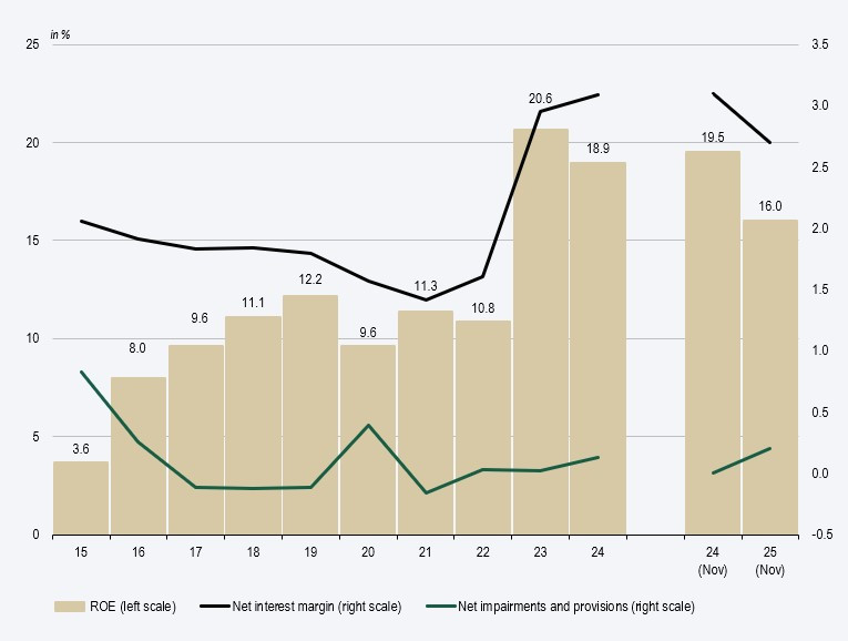 ROE, net interest margin, and ratio of impairment and provisioning costs to total assets