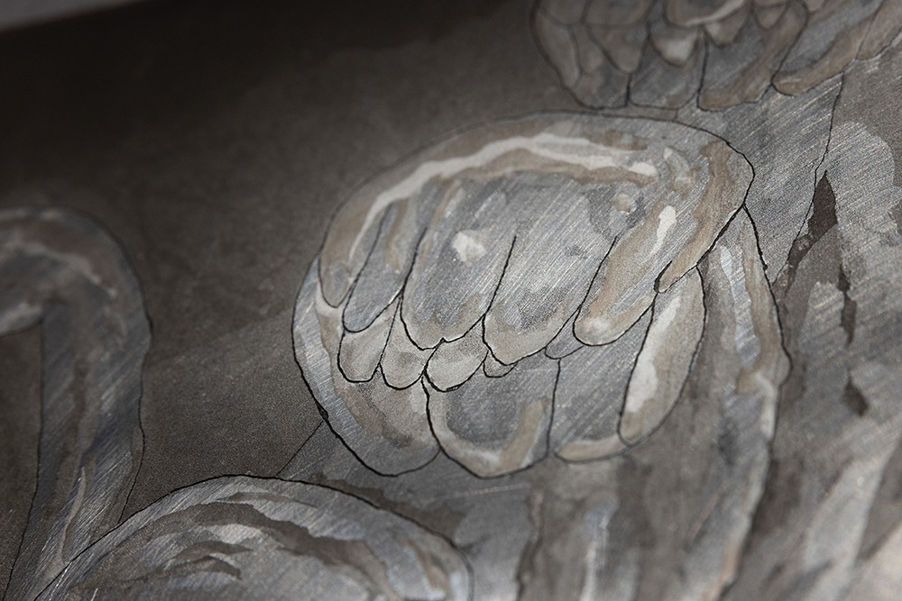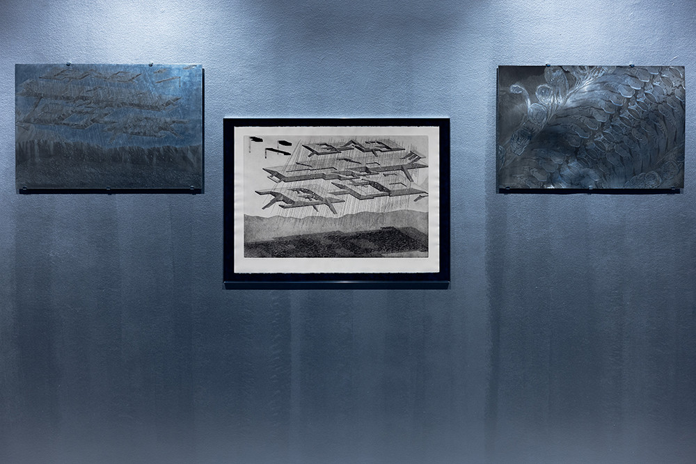 Through exhibitions, artistic interventions and workshops, they strive to broaden the understanding of printmaking techniques to a wider circle of people – both artists and the general public – who interact less frequently with such processes. This ambition has also informed the exhibition The Renaissance of Intaglio Printing, which presents a selection of prints made with their largest ever zinc-plate formats, alongside a short video detailing the intaglio printing technique. The collective's emphasis on broadening interest in this medium is also reflected in the graphic plates on display, offering viewers a glimpse behind the scenes of the printmaking process. In doing so, the collective draws attention to the importance of preserving and modernising printmaking practices and to the potential of printing as a contemporary artistic discipline.