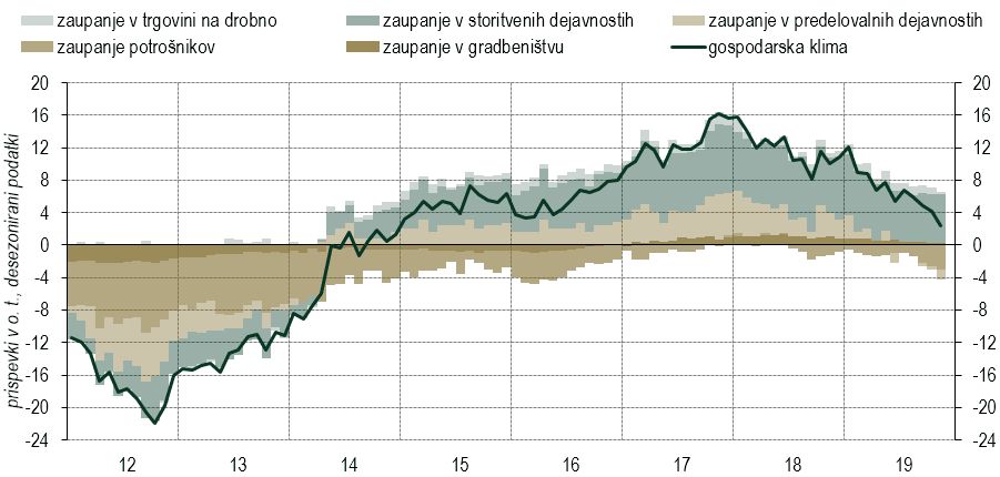 Gospodarska rast v Sloveniji se je v tretjem četrtletju medletno umirila na 2,3 %, ob čemer gospodarske razmere ostajajo ugodnejše kot v povprečju evrskega območja. Ob ugodnih razmerah na trgu dela je letos še posebej robustna zasebna potrošnja, kar je znak, da se zmanjševanje optimizma pri potrošnikih še ne odraža v njihovih nakupovalnih odločitvah. Manj ugodne so razmere na področju investicij. Zaradi velike negotovosti v mednarodni trgovini so investicije v opremo in stroje namreč šibke, čeprav finančni pogoji za investiranje ostajajo izrazito ugodni, realna rast izvoza in dodane vrednosti v industriji pa zelo solidni. Šibka investicijska gibanja v tretjem četrtletju so bila tudi posledica nižje rasti državnih investicij, s čimer je povezan tudi padec dodane vrednosti v gradbeništvu.