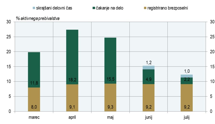 Ker so interventni ukrepi preprečili prenos večine padca BDP na trg dela, je 15,8-odstotni medletni padec števila opravljenih delovnih ur ustreznejši kazalnik razmer v letošnjem drugem četrtletju v primerjavi z le 1,9-odstotnim zmanjšanjem zaposlenosti. Posledice nove krize so doslej najbolj občutile predvsem mlajše generacije in zaposleni v prekarnih oblikah dela. Rast povprečne mesečne plače ostaja glede na raven gospodarske aktivnosti še naprej visoka.