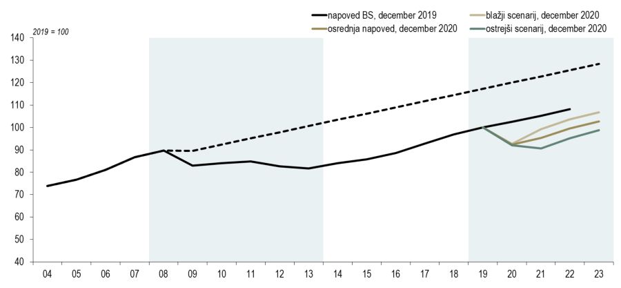 Opomba: Črtkana črta predstavlja trendno gibanje BDP pred letom 2008. Vir: SURS, napovedi Banke Slovenije.