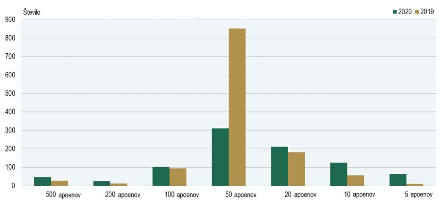 Skupna vrednost umaknjene gotovine se je v zadnjih treh letih s 720.000 evrov znižala na nekaj manj kot 75.000 evrov. Lansko leto je bilo iz obtoka umaknjenih 887 ponarejenih evrskih bankovcev in 2.622 ponarejenih evrskih kovancev. Pri evrskih bankovcih je bilo umaknjenih največ ponaredkov vrednosti 50 evrov (311 kosov), sledita bankovca za 20 (212 kosov) in 10 (126 kosov) evrov. Pri evrskih kovancih pa je bil najpogosteje umaknjen kovanec za 2 evra (2.154 kosov).