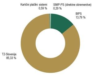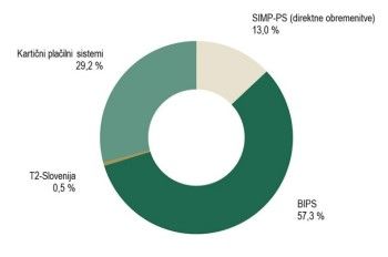 Največ transakcij je bilo poravnanih v plačilnih sistemih za plačila SEPA (70,28 %) in za kartična plačila (29,21 %). V obojih so poravnane transakcije malih vrednosti, zato transakcije v teh plačilnih sistemih skupaj po vrednosti predstavljajo zgolj 14,67 % skupne vrednosti. Na drugi strani pa je TARGET2-Slovenija namenjen predvsem poravnavi transakcij velikih vrednosti, kar vrednostno pomeni 85,33 %, po številu pa le 0,51 % vseh poravnanih transakcij.