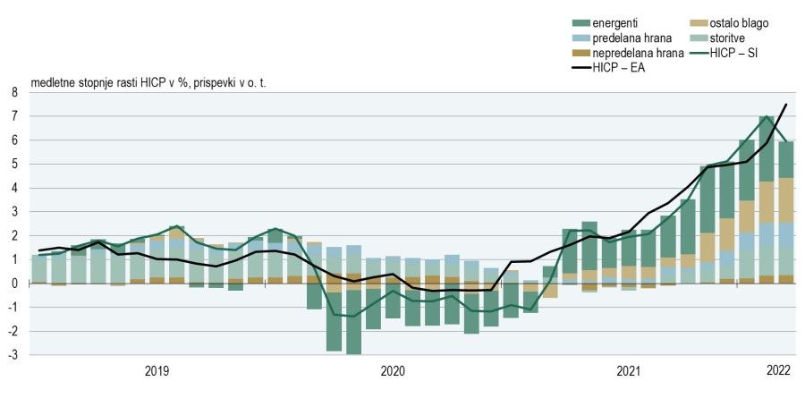 Inflacija je v Sloveniji marca znašala visokih 6,0 %, brez državnih ukrepov za ublažitev posledic visoke rasti cen energentov pa bi bila po naših grobih ocenah višja za več kot 2 o. t. Visoke cene energentov se v vse večji meri prenašajo v cene drugih dobrin, višanje inflacije, je prisotno v vse večjem deležu blaga in storitev, inflacijska pričakovanja potrošnikov pa so bila marca najvišja do zdaj.