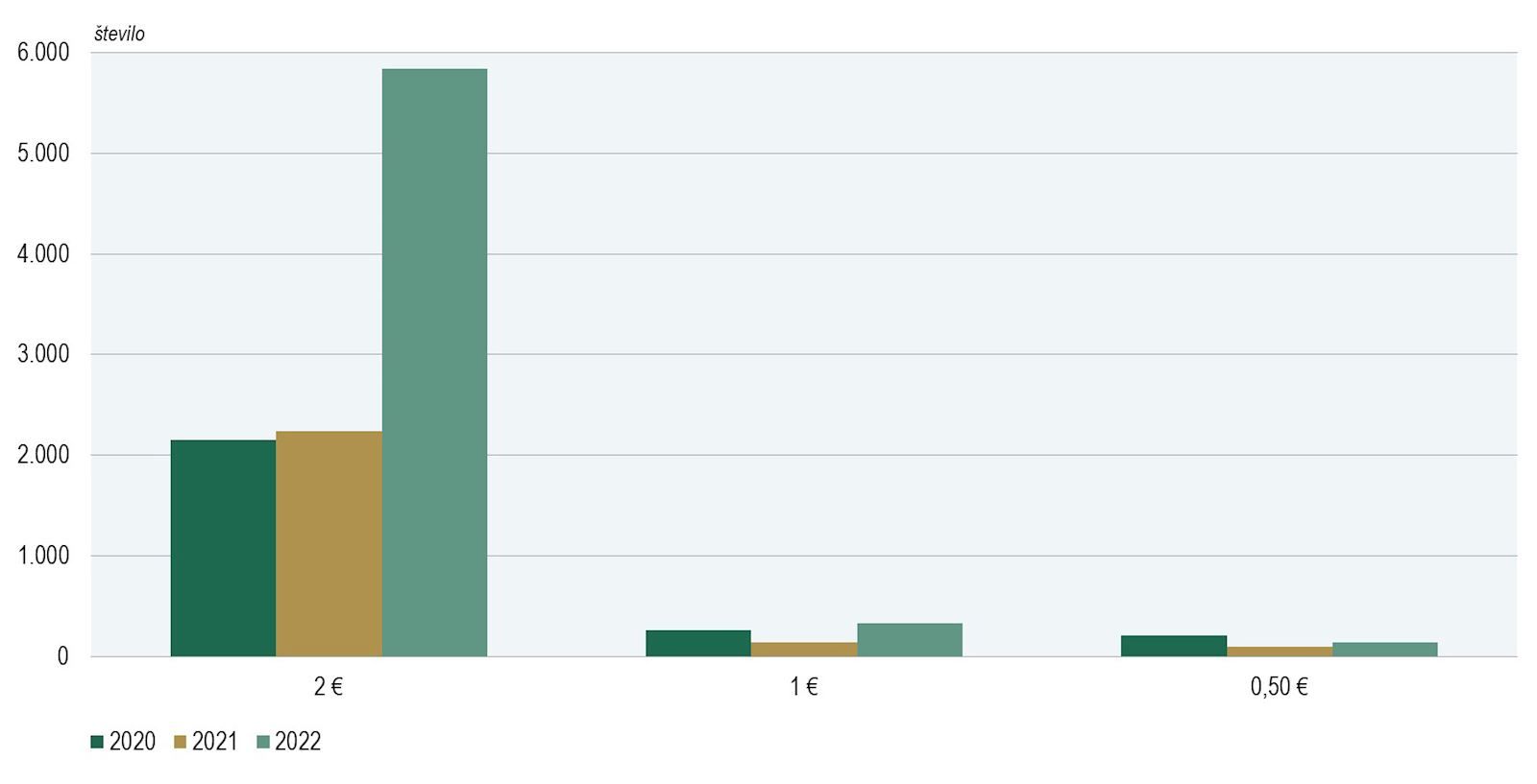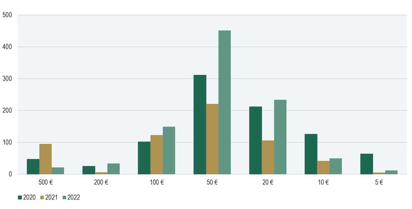 V letu 2022 je bilo tako iz obtoka umaknjenih 952 ponarejenih evrskih bankovcev in 6.320 ponarejenih evrskih kovancev, kar je za 59 % oziroma 155 % več kot v letu 2021. Pri evrskih bankovcih še vedno prevladujejo ponaredki apoena 50 evrov, pri evrskih kovancih pa je bil najpogosteje umaknjen kovanec za 2 evra.