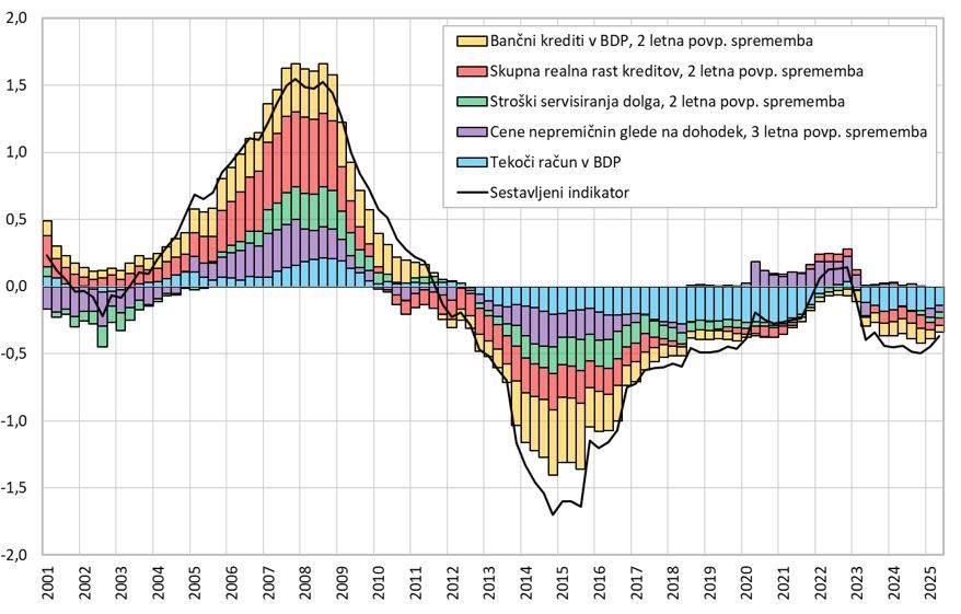 Posamezni kazalniki tveganja so združeni v sestavljeni indikator na način, da optimizirajo napovedno moč zgodnjega opozarjanja na krizo od pet do dvanajst kvartalov pred pojavom krize. Slika 3 prikazuje vrednost sestavljenega indikatorja v drugem četrtletju 2025 ter prispevek posameznih kazalnikov k sestavljenemu indikatorju. Od leta 2023 se sestavljeni indikator zaradi nižje kreditne rasti in izboljšanja razmerja tekočega računa v BDP znižuje. V drugem četrtletju 2025 se je vrednost sestavljenega indikatorja glede na prejšnje četrtletje povišala.