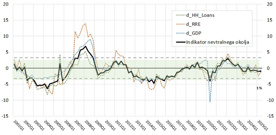 Indikator nevtralnega okolja se v trenutni fazi še vedno nahaja na sredini nevtralnega koridorja, kar pomeni določitev pozitivne nevtralne stopnje blažilnika pri 1,0 % (Slika 1).