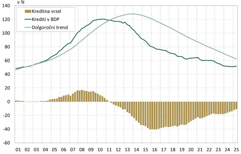 Opomba: V izračun kreditne vrzeli so vključena vsa bančna posojila (domačih in tujih bank) zasebnemu nebančnemu sektorju (nebančni sektor brez države) pred oslabitvami. BDP je preračunan na letno raven kot vsota nominalnega BDP v zadnjih štirih četrtletjih. Trend razmerja med posojili in BDP je ocenjen z rekurzivnim Hodrick-Prescottovim (HP) filtrom z lambda parametrom 400.000. Kreditna vrzel je razlika med dejansko vrednostjo razmerja med krediti in BDP ter trendom tega razmerja. Vir: Banka Slovenije.