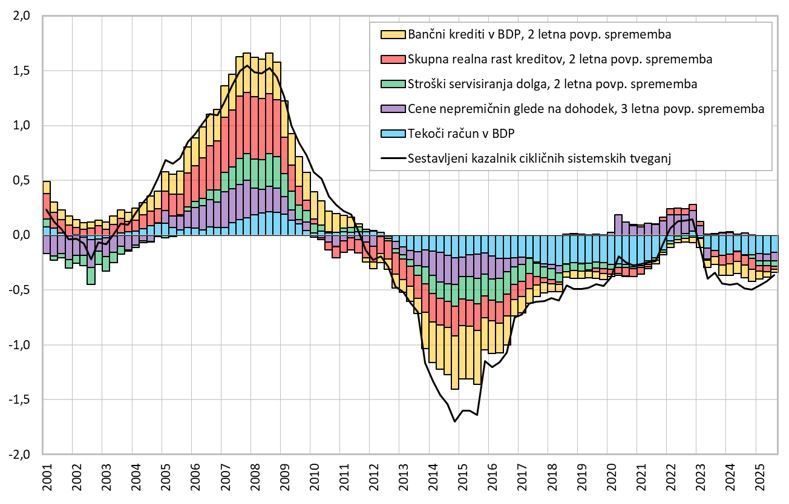 Posamezni kazalniki tveganja so združeni v sestavljeni kazalnik cikličnih sistemskih tveganji na način, da optimizirajo napovedno moč zgodnjega opozarjanja na krizo od pet do dvanajst kvartalov pred pojavom krize. Slika 3 prikazuje vrednost sestavljenega kazalnika v tretjem četrtletju 2025 ter prispevek posameznih kazalnikov k sestavljenemu kazalniku. V letu 2023 se sestavljeni kazalnik zaradi nižje kreditne rasti in izboljšanja razmerja tekočega računa v BDP obrnil navzdol. V tretjem četrtletju 2025 se je vrednost sestavljenega kazalnika že tretje četrtletje zapored nekoliko povišala.