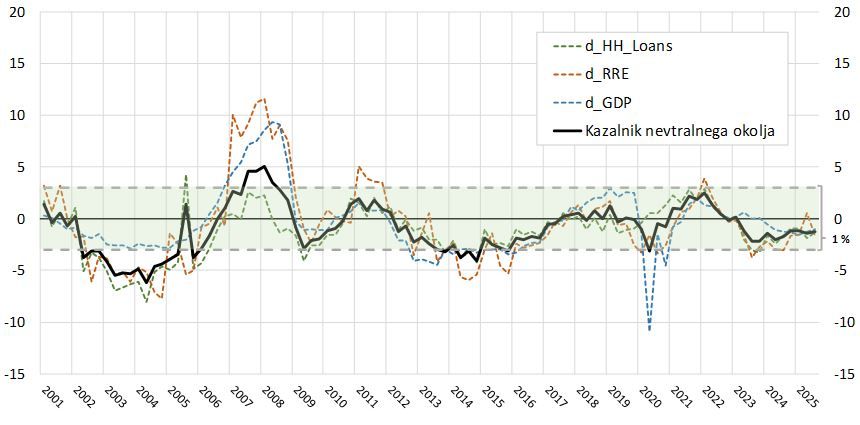 Kazalnik nevtralnega okolja se v trenutni fazi še vedno nahaja na sredini nevtralnega koridorja, kar pomeni določitev pozitivne nevtralne stopnje blažilnika pri 1,0 % (Slika 1).