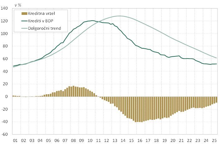 Kreditna rast nebančnemu sektorju je v letu 2007 presegla 35 %. V začetku leta 2005 je razmerje med krediti zasebnemu nebančnemu sektorju in BDP znašalo 65,8 %. Do konca leta 2008 se je razmerje med krediti zasebnemu nebančnemu sektorju in BDP povečalo za 44,4 odstotne točke, na 110,2 %, vrh pa je doseglo v tretjem četrtletju 2010, ko je doseglo skoraj 120 %. Visoka rast kreditov, ki je daljše obdobje prehitevala rast BDP, je potegnila oceno dolgoročnega trenda močno navzgor. Zaradi izrazite upočasnitve kreditne rasti po globalni finančni krizi in izrazitega padca razmerja med krediti in BDP je odstopanje razmerja med krediti in BDP od lastnega dolgoročnega trenda močno upadlo in doseglo najnižjo raven sredi leta 2016 (–41 %). Od leta 2016 se odstopanje razmerja med krediti in BDP od lastnega dolgoročnega trenda vztrajno znižuje.