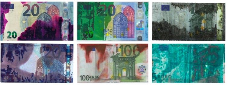 Nekaj fotografij bankovcev, ki so obarvani s črnilom: