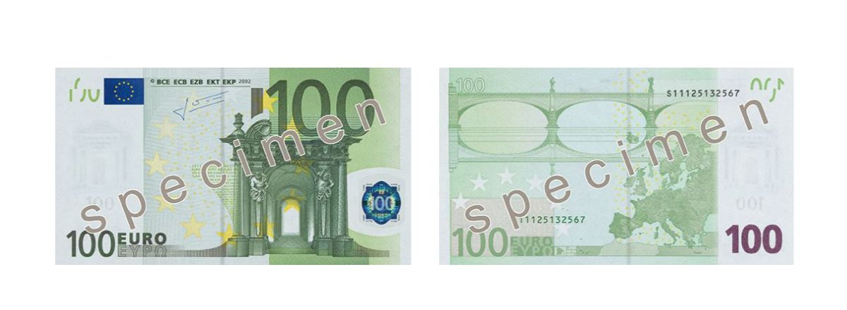 Arhitekturni slog: Na bankovcu za 100 € je prikazan arhitekturni slog baroka in rokokoja iz obdobja med letoma 1600 in 1750.