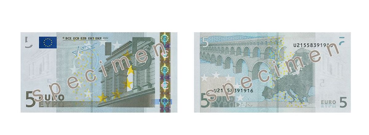 Arhitekturni slog: Na bankovcu za 5 € je prikazan antični arhitekturni slog (grški in rimski) iz obdobja od 8. stoletja pr. n. št. do 4. stoletja n. št.