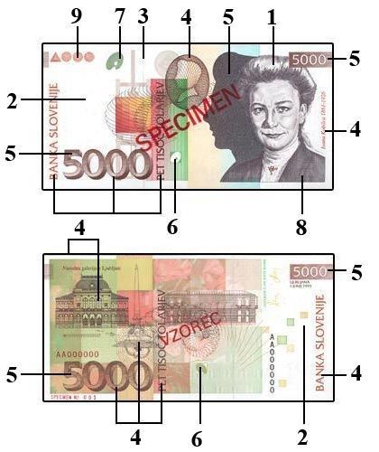 Primer zaščitnih elementov na bankovcu za 5.000 tolarjev.