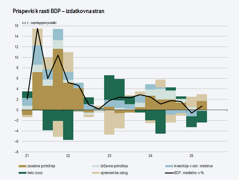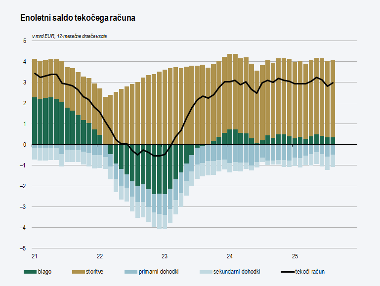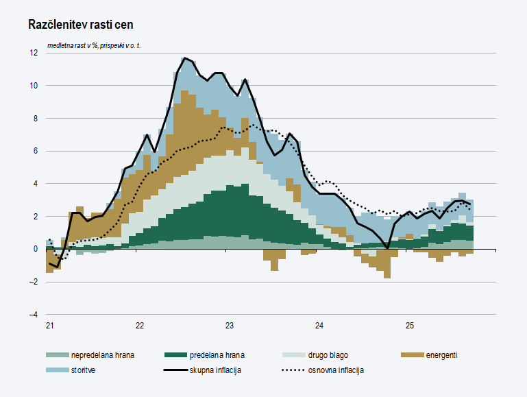 V Sloveniji se je po zadnjih podatkih v tretjem četrtletju nadaljevala rast gospodarske aktivnosti, a je bila nekoliko nižja kot v drugem četrtletju. Kljub temu naj bi presegala povprečje evrskega območja. Glavni dejavnik inflacije, ki se je sicer nekoliko umirila, so še naprej cene hrane in storitev. Trg dela ostaja tesen, kljub zniževanju števila delovno aktivnih, rast plač pa visoka. Primanjkljaj sektorja države se povečuje.