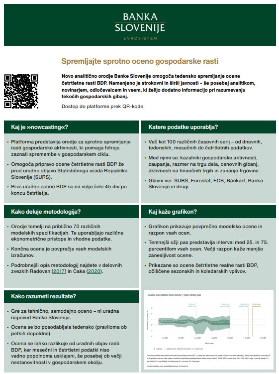 Po novem je na spletni strani Banke Slovenije na voljo orodje za sprotno oceno gospodarske rasti (angleško GDP nowcast) za Slovenijo. Modelska ocena se samodejno posodablja na tedenski ravni in temelji na najnovejših razpoložljivih podatkih. Orodje prinaša dodatni vpogled v aktualno stanje v slovenskem gospodarstvu.