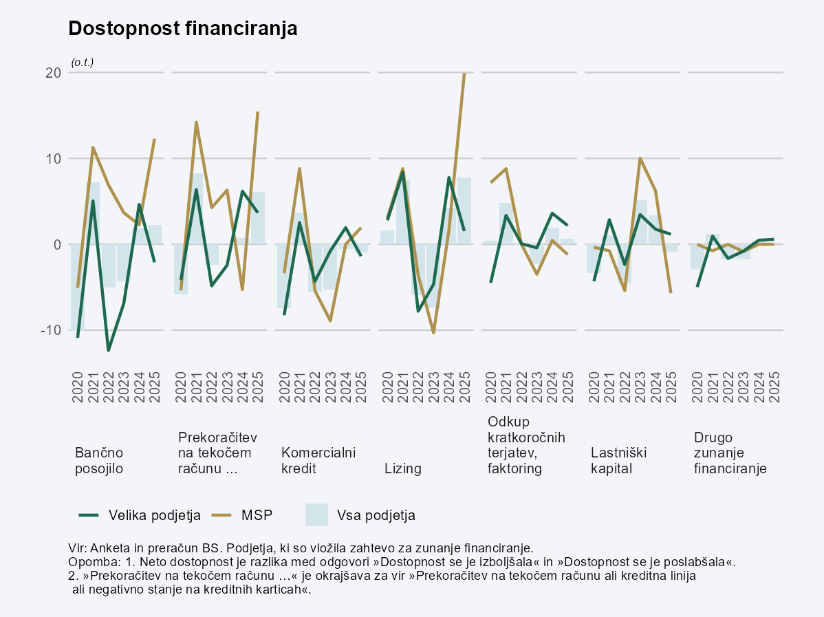 Raziskava, ki jo izvajamo v Banki Slovenije, je pokazala, da je dostopnost večine virov financiranja za podjetja v lanskem letu ostala ugodna. Leto 2025 je bilo tako drugo leto zapored, odkar smo z anketo zabeležili pozitivne trende na tem področju. Podjetja so tudi optimistična glede dostopnosti virov financiranja v letošnjem letu.