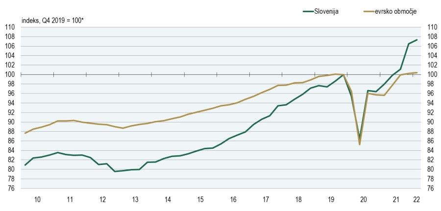 V Sloveniji so se v prvem letošnjem četrtletju nadaljevala ugodna gospodarska gibanja. Poleg potrošnje gospodinjstev je domačo aktivnost še naprej krepilo izdatno investiranje, pri čemer pomemben delež odpade na gradbeništvo. Domače povpraševanje je poganjalo rast uvoza, ki je ostala še močnejša od sicer robustne rasti izvoza. Učinki ruske vojaške agresije v Ukrajini in posledičnih sankcij se tako za sedaj odražajo predvsem v visoki rasti cen energentov in surovin.