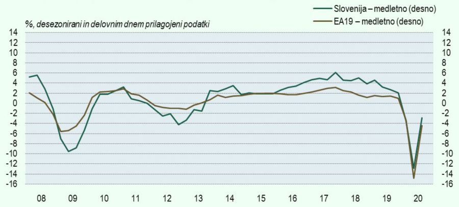 Odboj v gospodarski rasti je bil po podatkih Statističnega urada v tretjem četrtletju (12,4 %) ob sprostitvi najstrožjih omejitvenih ukrepov za preprečevanje širjenja koronavirusa pričakovano močan in primerljiv s tistim v evrskem območju (12,6 %). BDP je bil medletno manjši za 2,6 %.