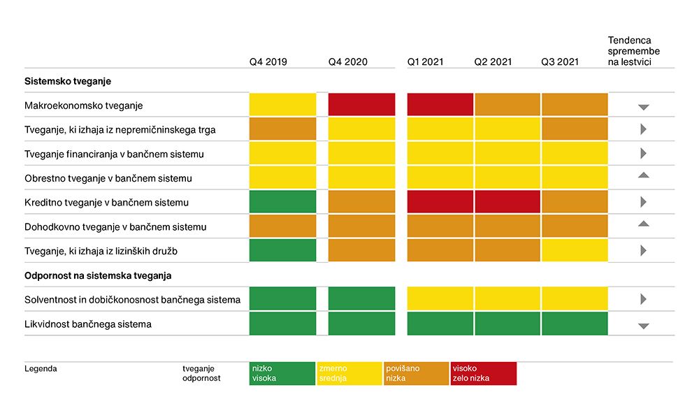Z okrevanjem gospodarstva so se izboljšali tudi pogoji poslovanja bank. Makroekonomsko in kreditno tveganje v zadnjih četrtletjih z okrevanjem gospodarstva postopoma slabita, a ob še vedno prisotni negotovosti glede nadaljnjega poteka epidemije ostajata povečani. Splošni nivo tveganj se glede na naše ocene v preteklih nekaj kvartalih nekoliko zmanjšuje, hkrati pa so bolj izpostavljena druga tveganja kot v bližnji preteklosti. Ob visoki rasti cen stanovanjskih nepremičnin se je okrepilo predvsem tveganje, ki izhaja z nepremičninskega trga. Bančni sistem pa se ob aktualnih izzivih sooča tudi s povečanim dohodkovnim tveganjem in izzivom dolgoročne vzdržnosti dobičkonosnosti. To bo srednjeročno najbolj zaznamovalo poslovanje tako slovenskih kot tudi evropskih bank.