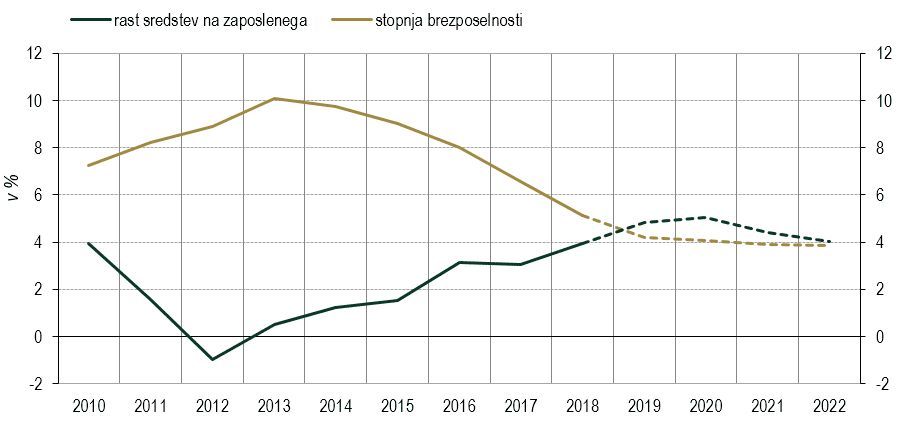Na trgu dela bodo razmere ostale ugodne, pri čemer se ob izzivih staranja prebivalstva vse bolj kažejo strukturna neskladja. Ta se ob nizkih stopnjah brezposelnosti v zadnjem obdobju odražajo v pomanjkanju ustrezne delovne sile, v obdobju napovedi pa tudi v zmernejši rasti zaposlenosti. Rast plač bo ostala razmeroma visoka, letos in naslednje leto predvsem zaradi dviga minimalne plače in lanskega dogovora v javnem sektorju.