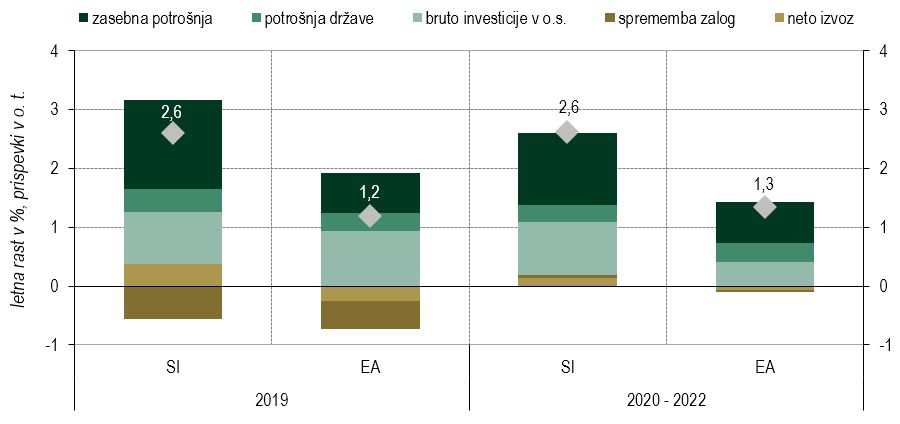 Gospodarska rast bo letos znašala 2,6 %, naslednje leto pa 2,5 %. Na podobnih ravneh naj bi se gibala tudi v letih 2021 in 2022. Glavno gonilo gospodarske rasti bo ob sicer solidni rasti izvoza predstavljalo domače povpraševanje. Rast gospodarske aktivnosti bo še naprej presegala povprečno rast v evrskem območju, s čimer se bo nadaljevalo dohitevanje najrazvitejših članic. Na trgu dela se ob pomanjkanju ustrezne delovne sile vse bolj kažejo strukturna neskladja. Inflacija se bo gibala na ravni okoli 2,0 %. To so ključne ugotovitve publikacije Napovedi gospodarskih gibanj, ki smo jo pripravili na Banki Slovenije. V njej opozarjamo tudi na tveganja, ki ostajajo izrazita in lahko ob uresničitvi pomembneje vplivajo na makroekonomska gibanja v napovednem obdobju.
