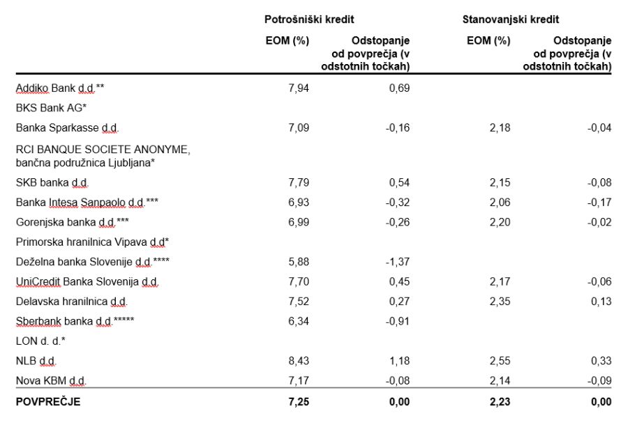 Podatki so pridobljeni iz spletnih kalkulatorjev posameznih bank in hranilnic, pri čemer smo uporabili povprečno ročnost in povprečen znesek kredita v letu 2021. Pri potrošniških kreditih povprečna ročnost znaša pet let, povprečen znesek kredita 12.000 evrov, pri stanovanjskih kreditih povprečna ročnost znaša 16 let, povprečen znesek pa 80.000 evrov. Pri obeh vrstah kreditov smo izbrali nespremenljivo obrestno mero, enostarševsko družino z dvema vzdrževanima otrokoma (kjer je bil izbor možen) ter predpostavili, da gre za komitenta banke oziroma hranilnice.