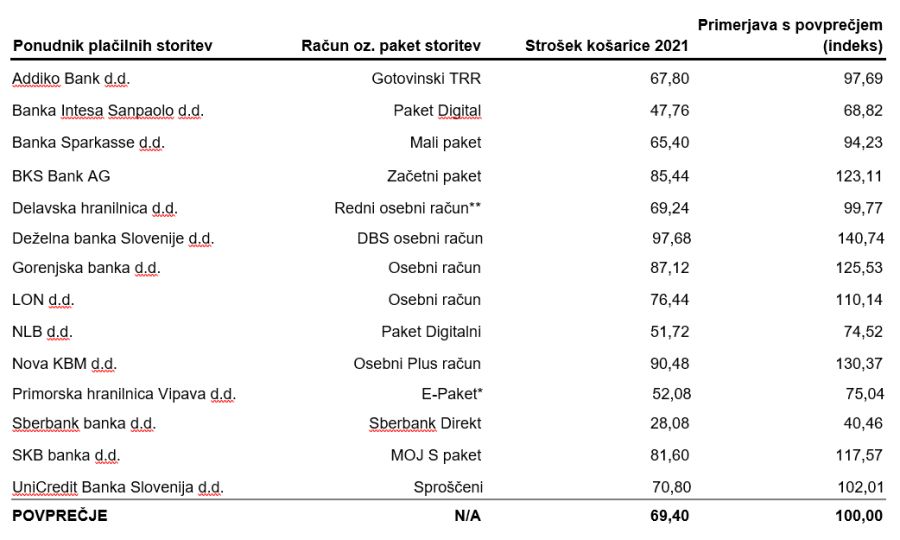 Opomba: V primerjavo so vključeni tudi paketi, ki so dostopni le novim komitentom ali obstoječim z doplačilom za zamenjavo, ter paketi, odprtje katerih je možno zgolj preko spleta. Sprememba lastništva banke ali hranilnice lahko vpliva na njeno ponudbo.